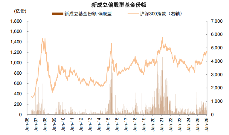 图表10:1月新成立偏股基金份额快速增长至1012亿份