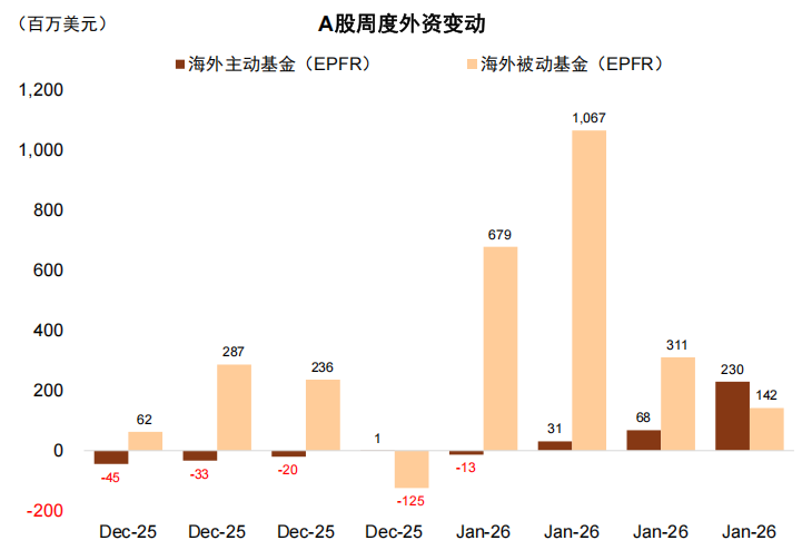 ► 北向资金:新货币秩序下人民币资产相对受益,外资逐步回流A股市场。中金研究部缪延亮博士去年6月发布的《货币秩序重构下的资产变局》指出,新货币秩序下,美元步入下行周期,美债利率对非美市场定价的“锚”作用下降,对人民币资产的压制作用也可能减弱。此外,人民币资产有望受益于全球货币体系加速碎片化、多元化的双重红利,其中碎片化有望加速中国在海外的资金回流,多元化将驱动全球资金再平衡,推动部分资金回流中国资产市场。结合最新数据,当前全球货币体系已出现部分碎片化及多元化迹象,与此同时,人民币汇率修复也将驱动外资回流A股市场。从北向资金来看,截至2025年12月31日北向资金持仓金额2.59万亿元。我们根据交易所披露的12月31日北向资金持股数量以及期间均值估算,四季度北向资金小幅净流入117亿元。从更为高频的EPFR数据来看,12月中下旬以来伴随A股市场表现提振,海外被动型基金持续流入,主动型基金也转为净流入,未来外资布局A股市场意愿有望进一步回升。
