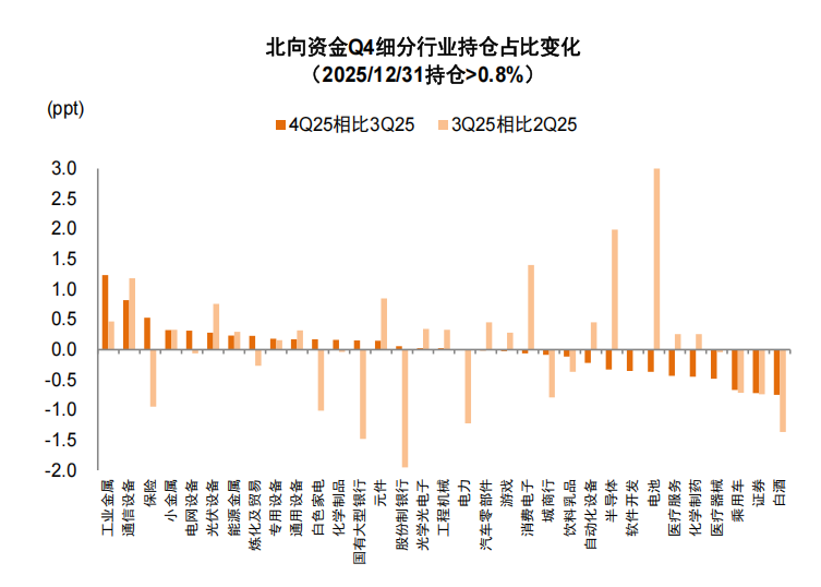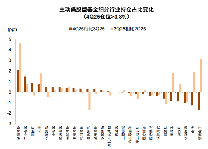 结构配置方面,近期A股机构关注度再度抬升,公募和外资普遍加仓有色金属、通信等板块。四季度机构持仓配置存在以下特点:1)A股配置比例有所提高。近年来主动偏股型基金股票仓位相对稳定背景下,2Q24公募对港股配置力度快速提升,截至2Q25 A股/港股仓位占比分别为70.6%/16.9%,再创历史新高,此后A股市场相较港股跑赢,A股配置比例边际抬升,截至4Q25 A股仓位占比增长至72.8%,但仍处于近10年偏低水平。私募基金A股占比上升和港股占比下降的特征也较为明显,CREFI指数成分基金的股票资产中,港股配置比例由去年年中40%左右高点回落,截至去年12月A股及港股配置比例分别为66%/34%。2)行业层面,四季度主动偏股型基金主要加仓有色、通信及非银金融等行业,减仓电子及医药生物等行业。新兴产业景气推动上游需求抬升,海外流动性宽松及需求端持续向好等多重因素推动有色金属价格延续强势,行业景气与基本面支撑较为坚实,有色金属四季度获加仓最多,仓位上升2.3个百分点;AI算力相关设备维持高景气,通信获加仓2个百分点。减仓行业方面,上季度获加仓最多的电子,本季度减仓1.8ppt,医药生物也获1.7ppt减仓。北向资金方面,四季度主要加仓有色金属、通信及基础化工等板块,仓位分别提升2.0/0.7/0.3个百分点;主要减仓医药生物、食品饮料及汽车等板块,仓位分别下降1.6/0.9/0.5个百分点。对比来看,主动型公募基金与北向资金一致加仓有色金属、通信等板块,一致减仓医药生物、食品饮料等板块。