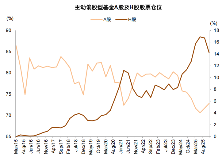 图表13:主动偏股型基金A股配置比例有所提高
