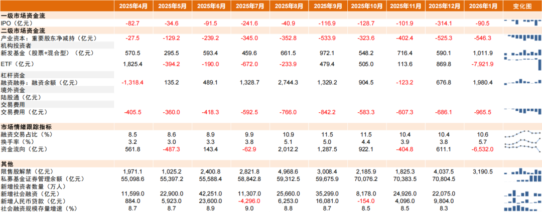 ► 产业资本:产业资本净减持规模有所增长,上市公司回购积极性仍处于相对高位。产业资本方面,伴随市场上涨,上市公司净减持规模边际增加,4Q25/1月至今分别净变动-1318/-505亿元,但净减持强度仍低于历史均值。年初至今电子、通信及医药为主要减持方向;交通运输、银行、电力及公用事业为主要增持方向。回购方面,上市公司回购积极性整体较高,2025年全年累计规模1432亿元,但近期回购规模小幅回落,4Q25月均/1月至今回购101/64亿元(vs.3Q25月均回购规模126亿元)。
