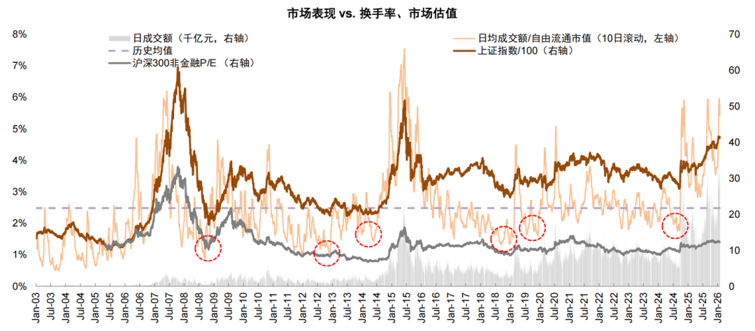 ► 两融资金&私募基金:高风险偏好资金先行,融资余额及私募仓位明显抬升。两融资金方面,融资余额通常与市场表现呈现正相关,2024年“924”以来,A股市场两融规模经历三次较快上行,分别是“924”到2024年10月、2025年6月至10月,以及2025年12月至今,同期市场表现均出现明显提振。近期两融余额自2025年9月突破历史高点后继续上行,突破2.7万亿元,续创历史新高,本轮行情至今净流入近2400亿元,成为近期市场表现的重要推动之一,但从相对规模占比来看,仍处于合理水平。1)从市值上看,截至1月30日, 两融余额占A股市场自由流通市值的5.06%,略高于2014年以来的均值4.76%;2)从成交上看,2026年以来两融交易额占A股总成交额均值为10.5%,仍明显低于2015年20%左右的峰值水平。私募基金方面,4Q25私募基金证券投资规模明显抬升,月均7.0万亿元(vs.3Q25 5.93万亿元)。仓位方面,根据华润信托公布相关托管产品数据,4Q25平均股票仓位63.2%,其中12月仓位环比增加3.1个百分点至64.4%,出现较为明显提高,反映市场风险偏好改善,但仍略低于历史均值66%。