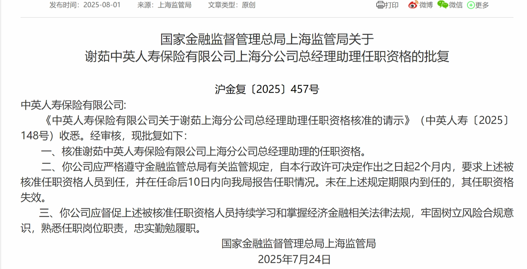 8月1日,国家金融监督管理总局上海监管局发布《关于谢茹中英人寿保险有限公司上海分公司总经理助理任职资格的批复》,核准谢茹中英人寿保险有限公司上海分公司总经理助理的任职资格。